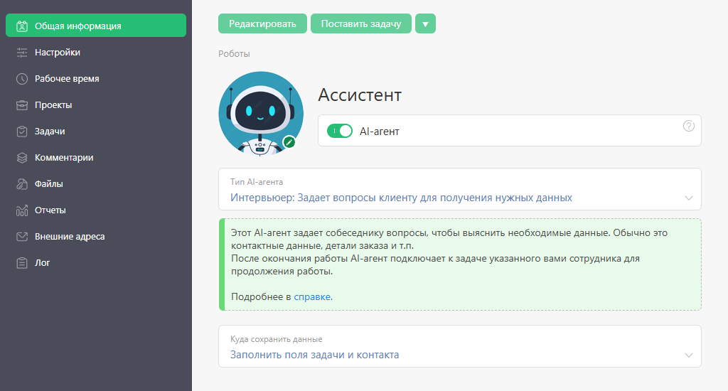 Основные настройки происходят в разделе «Сотрудники». Выбираем свободного робота или создаем нового и активируем в его карточке функцию AI-агент. Далее выбираем тип агента — Интервьюер и задаем место для хранения полученных из опроса данных: