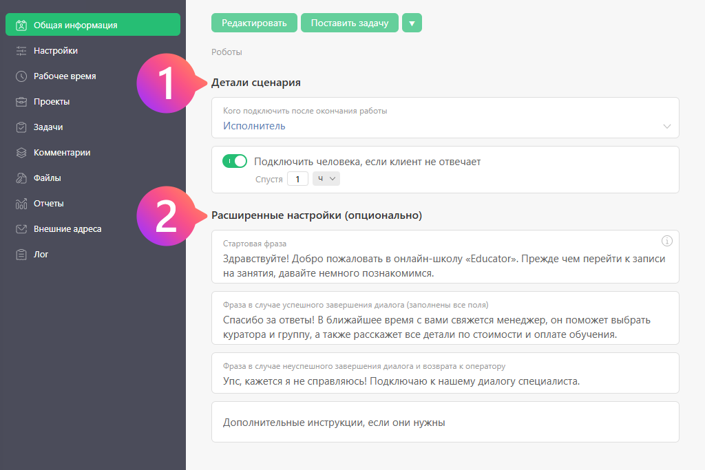2. Расширенные настройки агента: стартовую фразу, а также сообщения при успешном и неудачном завершении диалога: