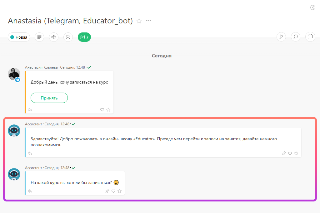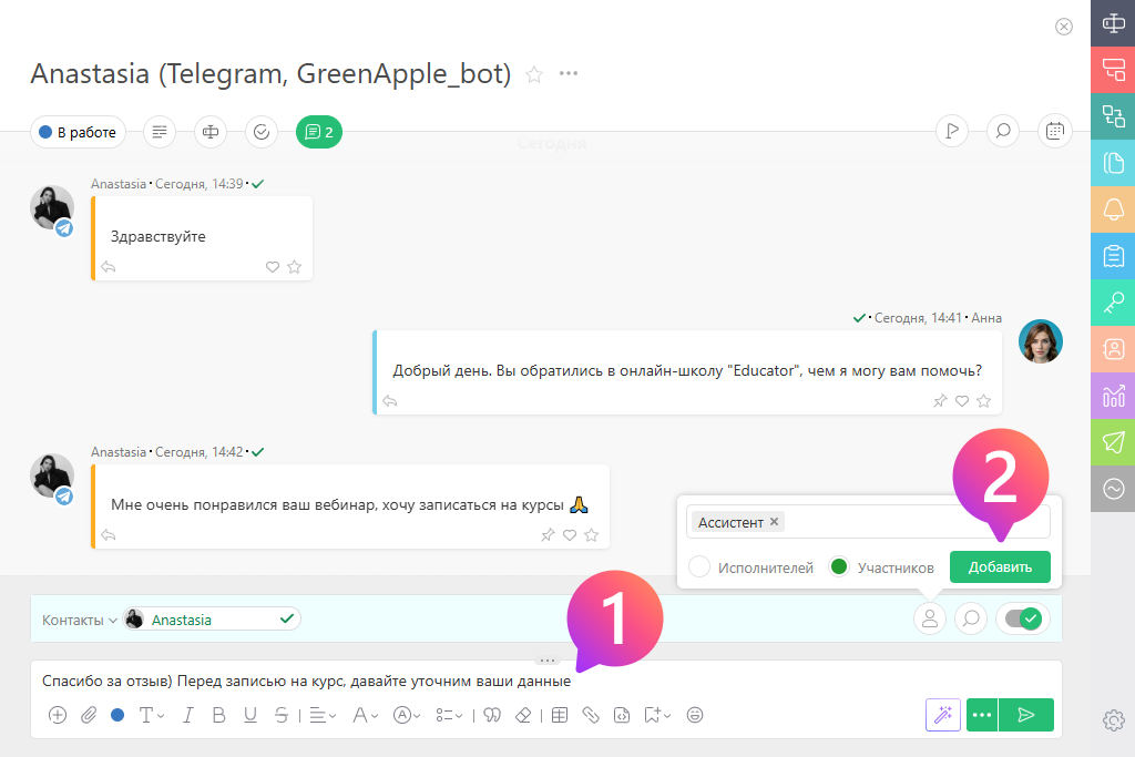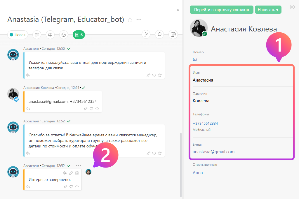 Когда AI-агент получит необходимые ответы, он добавит их в указанные поля заявки и (или) контакта (1). А затем подключит к диалогу менеджера (2), который продолжит общение с клиентом, если это предусмотрено вашим бизнес-процессом:
