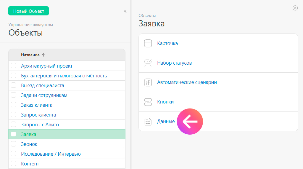 - В настройках Объекта появилась вкладка «Данные». В ней собраны задачи, созданные по этому Объекту.