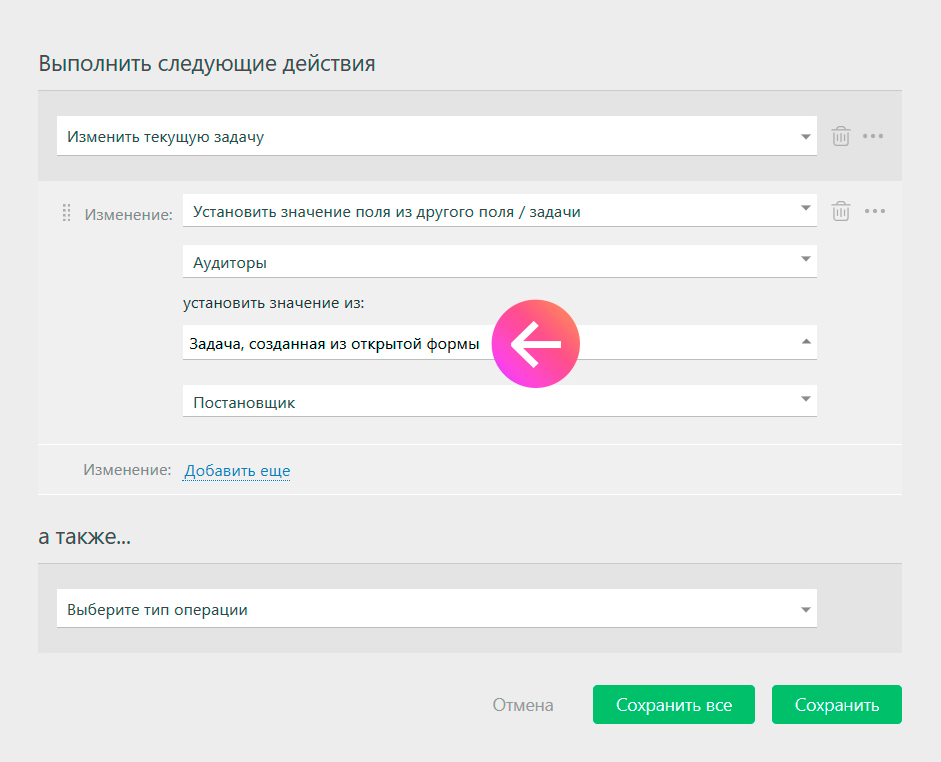 - В операции «Открыть форму создания задачи» появилась возможность передавать данные из новой задачи обратно в исходную.