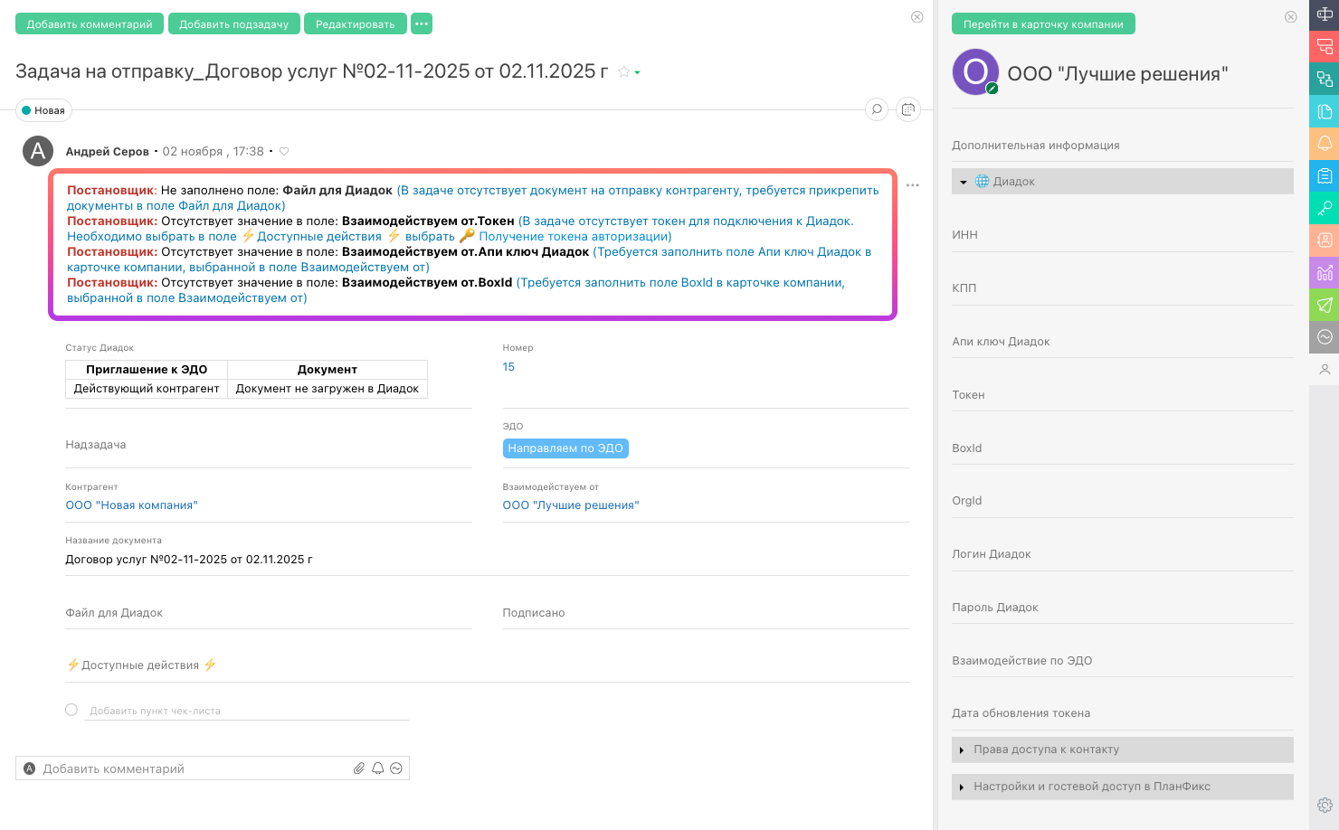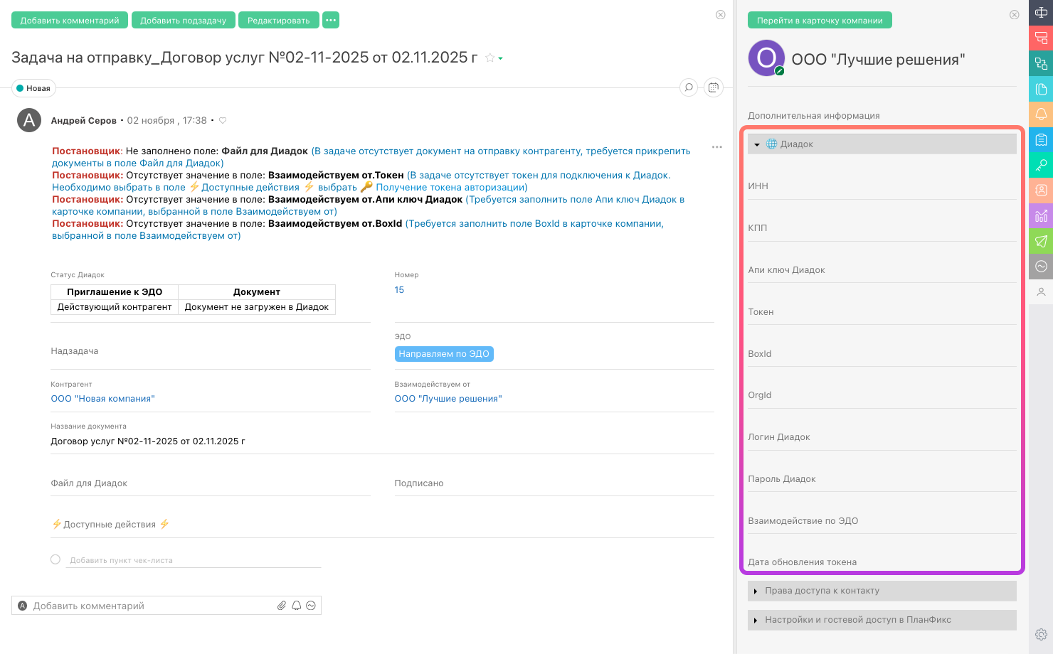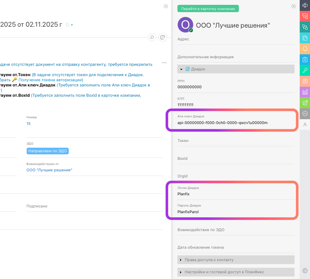 В карточке вашей компании в ПланФиксе указываем полученный от Диадока API-ключ, логин и пароль от учетной записи «цифрового сотрудника». По сути, вы знакомите свою CRM со своим электронным клерком.