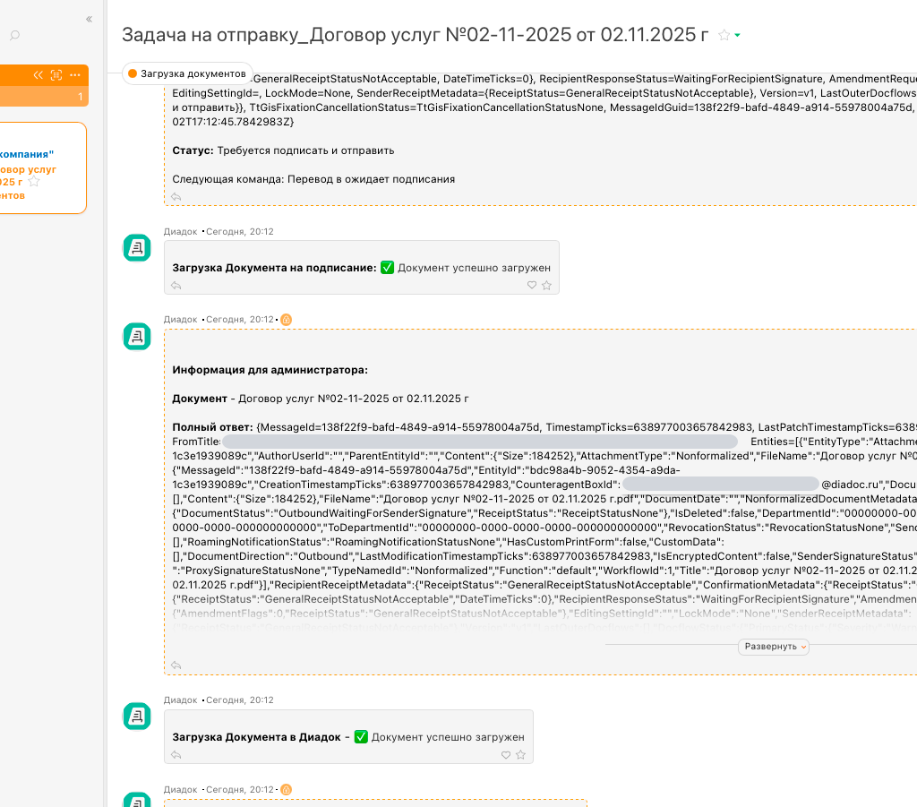 5. Загрузка документа. После принятия приглашения документ из поля «Файл для Диадок» загружается во временное хранилище Диадока, а затем направляется на подписание к вам.