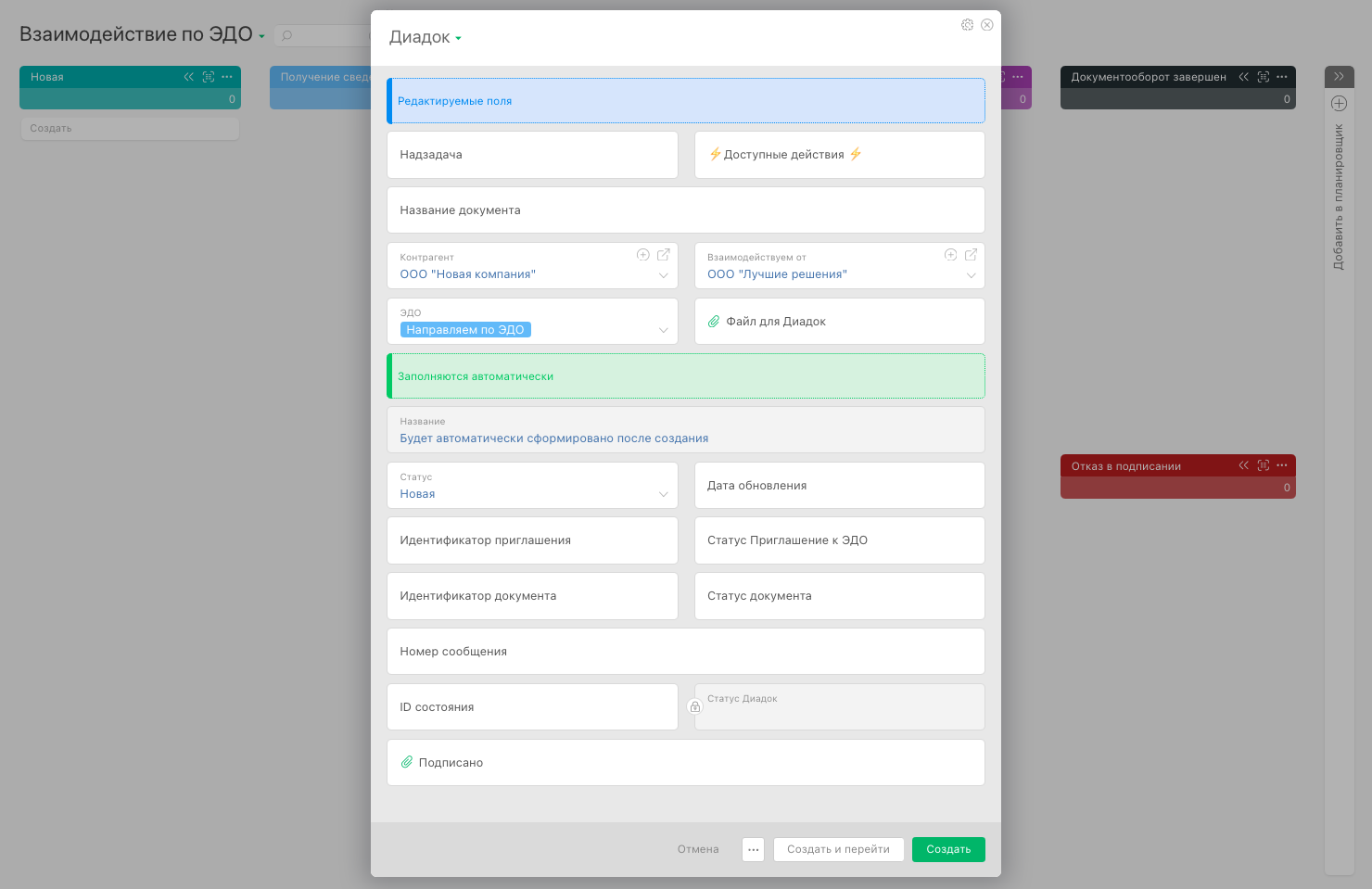 В вашу систему волшебным образом добавляется новый объект «Диадок» со всей необходимой структурой.