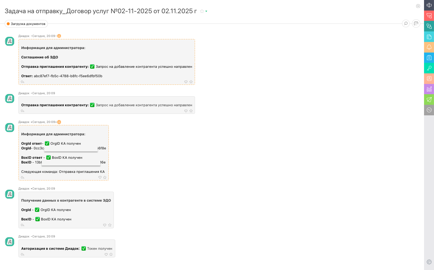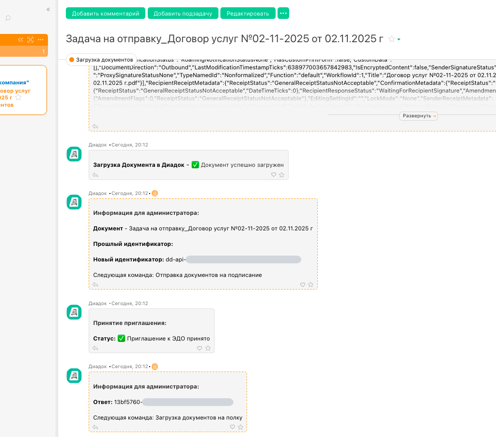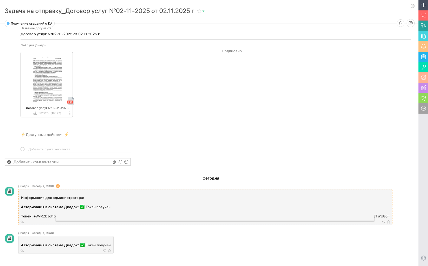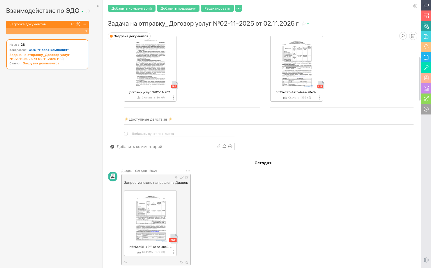 7. Отслеживание подписания. После вашей подписи документ уходит контрагенту. ПланФикс продолжит отслеживать его статус по ночам и, как только он будет подписан, автоматически скачает итоговый подписанный файл и прикрепит его в карточку. Больше вам не придется дергать бухгалтерию с вопросом: «Ну что, подписали уже?»