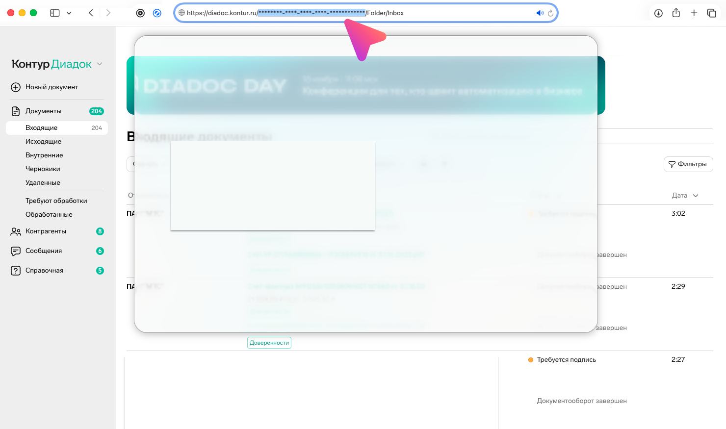 Заходим в личный кабинет Диадок. В адресной строке браузера вы увидите ссылку вида …kontur.ru/ВАШ_BOX_ID/Folder.