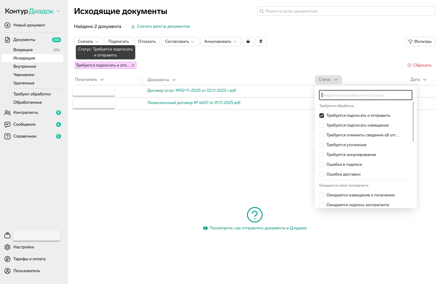 6. Ваше действие. Вам остается зайти в исходящие Диадока и одним кликом подписать документ. Все документы из ПланФикса приходят в статусе «Требуется подписать и отправить» — вы ничего не пропустите. Это единственный шаг, где нужно действовать вручную.