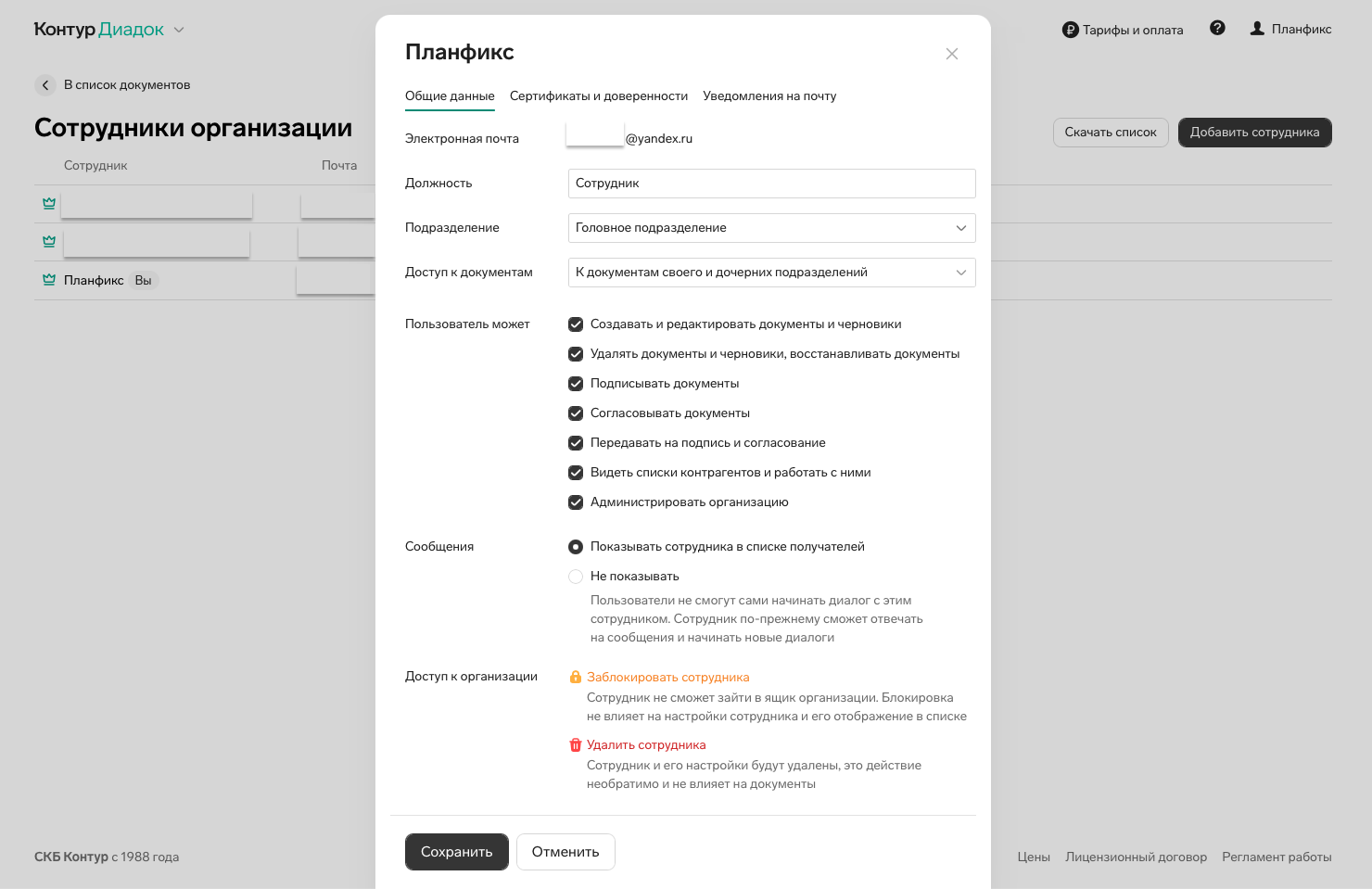 Добавляем созданную учетную запись в свою организацию в Диадоке и выдаем ей все необходимые права. Теперь у Роберта есть доверенность на подписание и отправку. Он не просит отпуск и не ходит на обеденные перерывы.