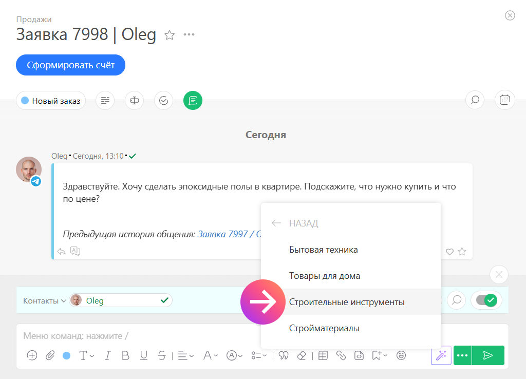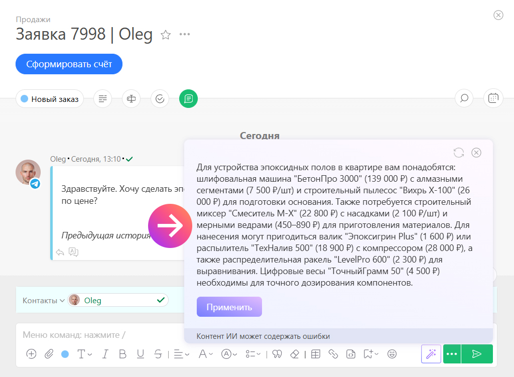 Представим ситуацию: клиент строительного магазина просит подобрать оборудование для подготовки эпоксидных полов у себя дома. Менеджер на секунду задумывается — тема знакомая, но что точно есть в каталоге, он сходу вряд ли вспомнит.