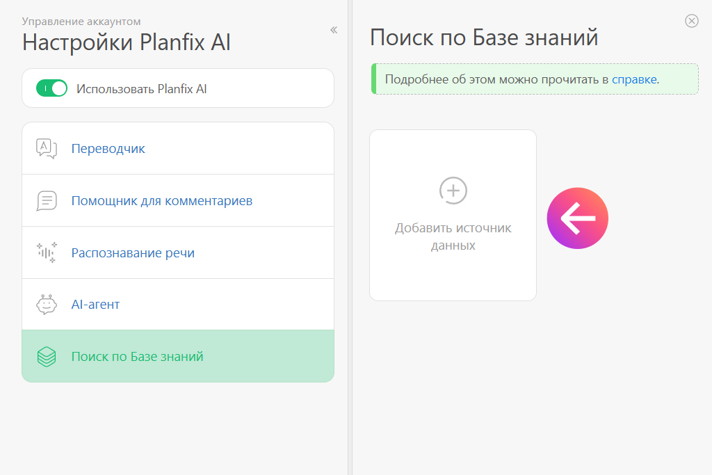 Переходим в «Управление аккаунтом», затем — в настройки Planfix AI и раздел «Поиск по Базе знаний».