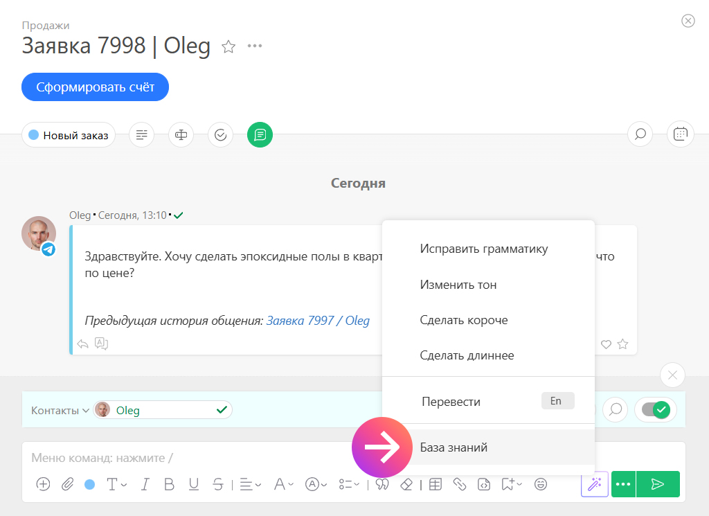 После завершения настройки пункт «База знаний» появится в меню Planfix AI в поле добавления комментария.
