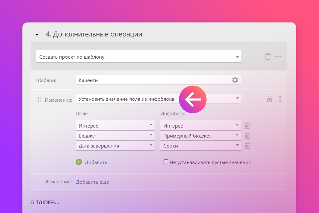 Теперь в сценариях, кнопках и почтовых правилах можно брать данные из инфоблоков и автоматически подставлять их в поля проекта при его создании.