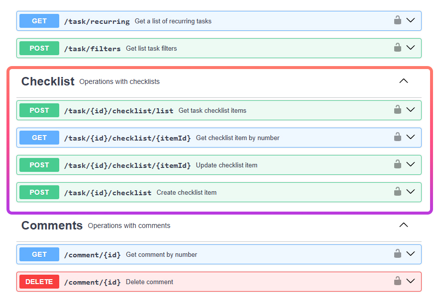 Теперь чек-листы можно создавать через REST API. Представьте: клиент оформил заказ, и в задаче сразу появляется готовый чек-лист из 15 пунктов. Без ручной работы, без «ой, забыл».