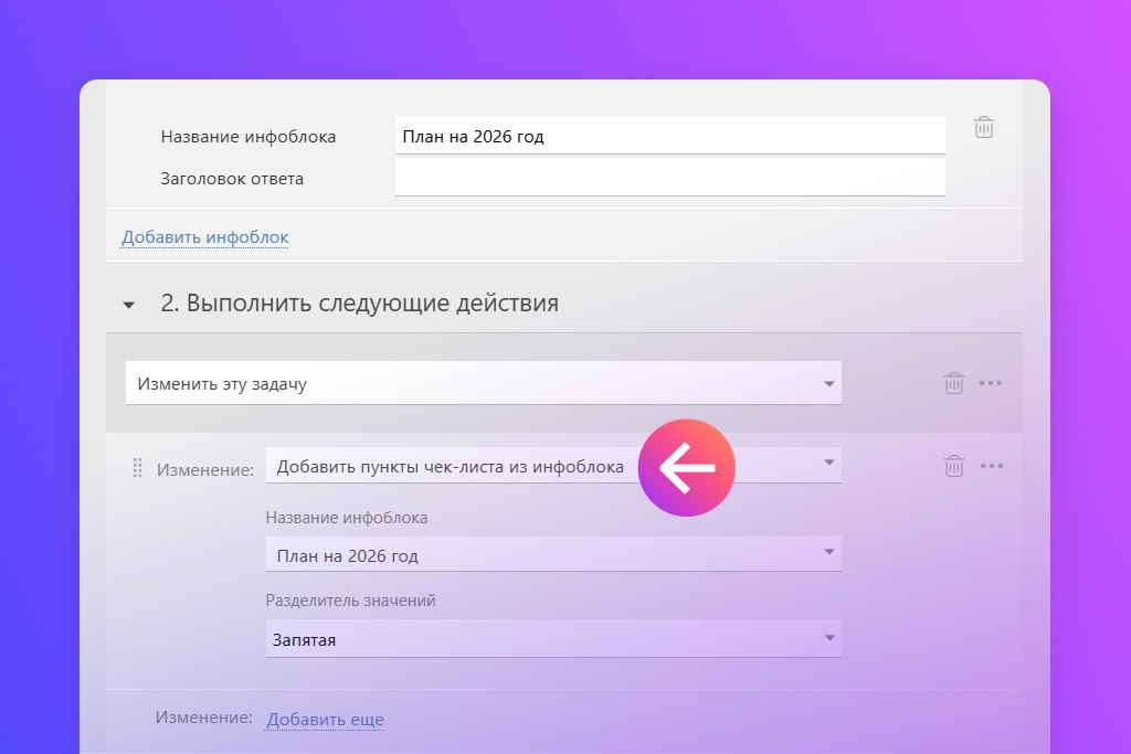 Не используете API? Не проблема. В автоматических сценариях теперь можно массово создавать пункты чек-листа прямо из инфоблока. Настроили один раз, и рутина делает себя сама.
